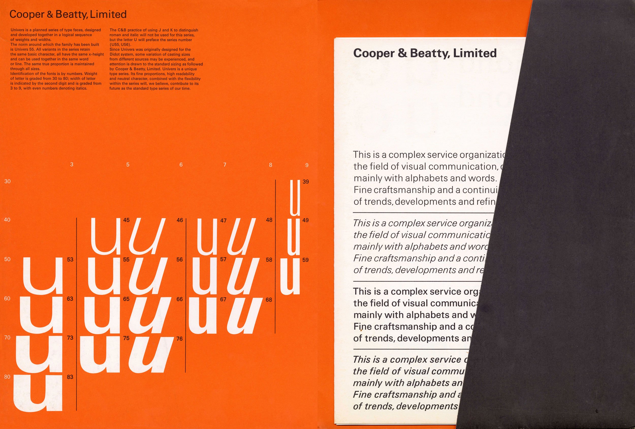 Univers always looks new to me. It’s a typeface that somehow does not age, does not look its age, and does not diminish other typefaces when in use. This is the interior of a type specimen by Cooper & Beatty, the renowned typesetting company based in Toronto, showing the letter “u” in different weights, organized by number. It can be made to look icy but the designer of Univers, Adrian Frutiger, took care to keep the letters clean but not cool. The warm orange, plentiful negative space and dark grey pocket make this specimen feel astonishingly contemporary.