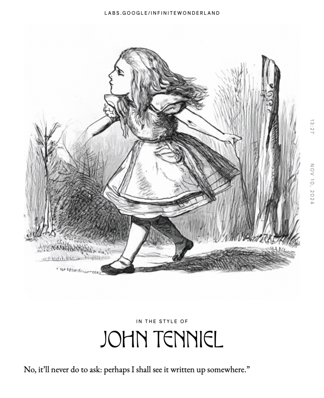 In interacting with Google’s Infinite Wonderland site, you can watch images being generated one by one in real time by the processing algorithm, each styled according to the likes of Tenniel or any of the four contemporary illustrators. They are mesmerizing and oddly engaging.